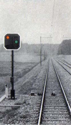 Corsa a 40 Km/h. Se nell'orario di servizio è presente una velocità inferiore quest'ultima è vincolante - Una luce arancione ed una verde sovrapposte diagonalmente: Il successivo segnale è disposto a via libera con conferma di riduzione di velocità |
