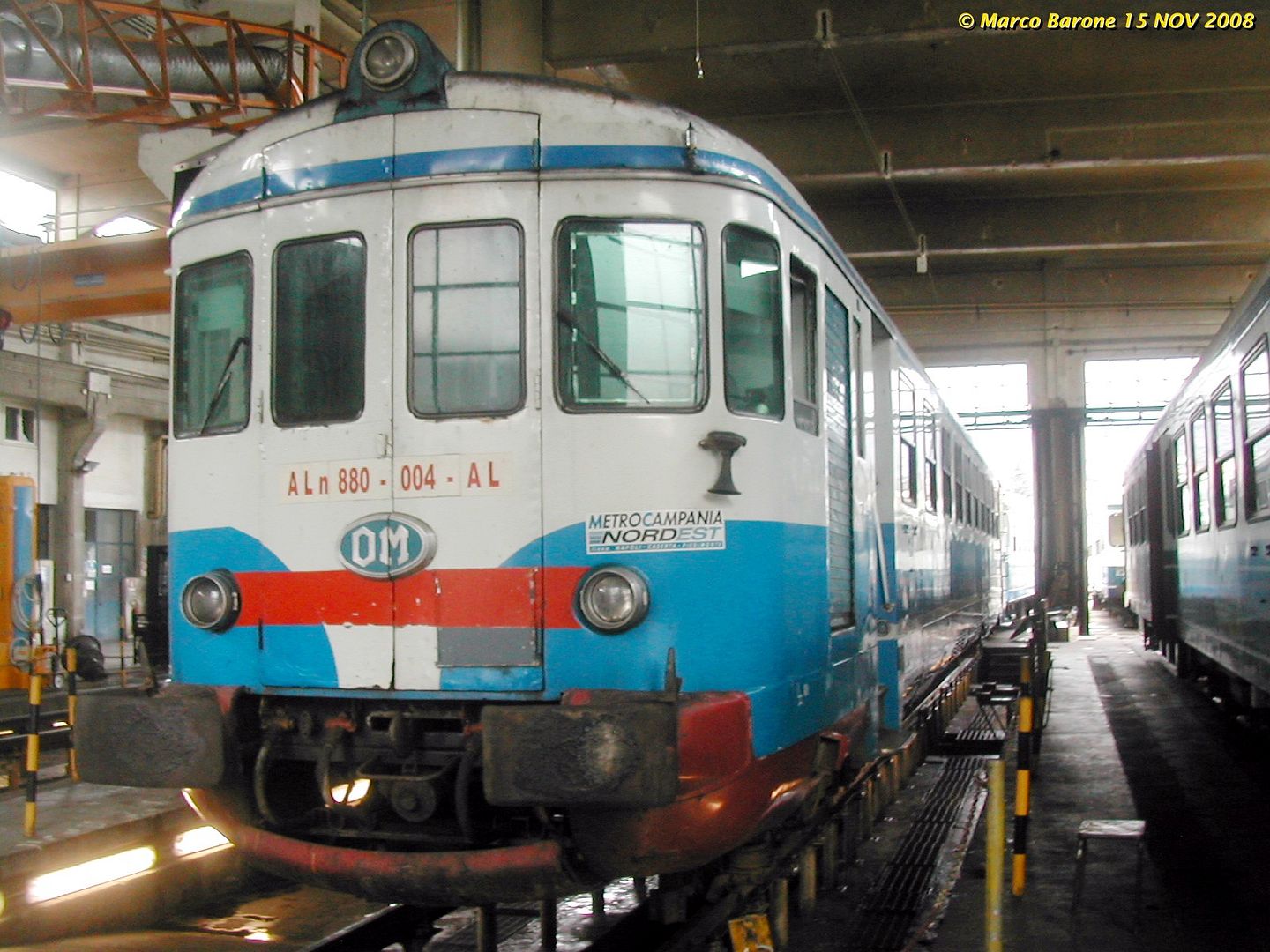 Cliccare sull'immagine per ingrandire All'interno dell'officina sono in sosta le due Aln880 superstiti della fornitura originaria del 1961-62, costruite specificamente per la nuova ferrovia Alifana sul modello delle Aln773 FS ma con motore più potente e maggior numero di posti a sedere; la 004 in revisione...